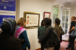 Ms. Yasco Nagashima with a guest in front of her work in the Romansch language |