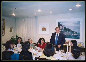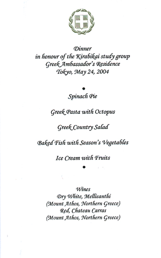 ギリシャ大使公邸にて、あたたかくエレガントな夕食会が開かれました。 MGスクールの生徒のために開かれたこの会では、ロードゥーサキス大使の歓迎を受け、 ガチーニ先生の長年の文化的協力と教えに、感謝の意が示されました。 更に参加者に資料が配られ、ロードゥーサキス大使によるギリシャ文字の前史からの発展と ギリシャアルファベットの進化、ビザンチン時代の写本の説明がありました。 続けて、ガチーニ先生による、ギリシャ文字の歴史の説明や温かいもてなしへの 感謝の言葉があり、2004年のオリンピックの成功を祈って、みんなで乾杯しました。 |
