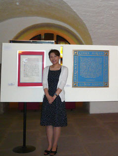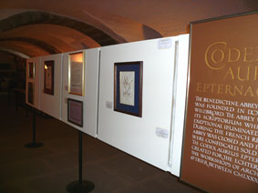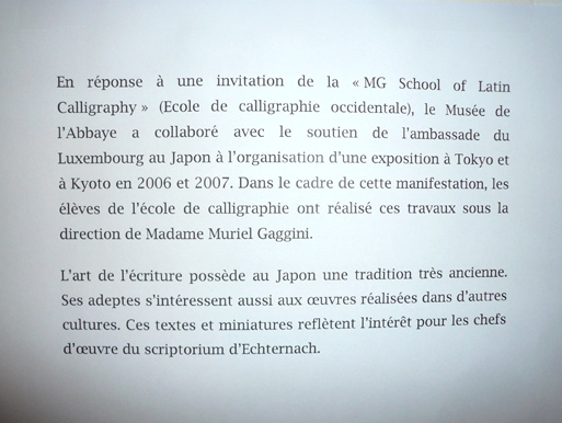 その展示会が、昨年2006年11月から4ヶ月間、東京・京都で催されました。 (詳しくは、MGスクールの国際活動を御覧下さい) 日本では、The MG School of Latin Calligraphyによって、 エヒテルナッハの伝統が引き継がれています。 今回、日本の展示に続き、本場であるルクセンブルグの エヒテルナッハ修道院美術館にて、生徒作品が展示される事となりました。 MGスクールからは、11世紀の写本製作の技術を習得した 16名の優秀な生徒の作品が、美術館の作品に並べて展示されています。 |