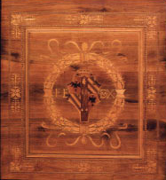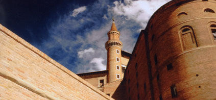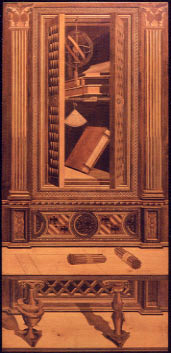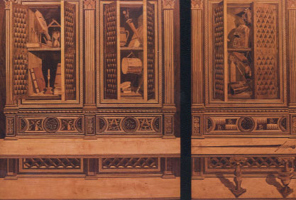 ![]() <左:定規・コンパス・砂時計・楽器 > <中央:短剣・器・太鼓・ふいご> <右:兜・兜飾り・ムチ・よろいの一部・椅子の上に刀> ストゥディオーロの緻密に計算された装飾プランは、 フェデリーコ・ダ・モンテフェルストロ哲学的信念と趣味を端的に表しています。 遠近法の法則を厳密に適用して表現された複雑な図象は、 「哲人政治家」というプラトン的概念を中心に据えています。 それはフェデリーコ・ダ・モンテフェルロが良き政府の土台と考えていたものであり、 政治の道具としての文化の力という概念は、紋章や勲章、戸棚の中や長いすの上に置かれた事物、 すなわち古代の文筆家の本(書見台に開いて置かれた『アイネイス』のページ)や 科学の器具類(天文観測のための天球儀や四分儀、または幾何学の実践に必要な三角定規やコンパス)、 リュートやオルガンといった精巧な楽器類、菓子箱など日常の気晴らしのための事物、 兜や剣といった軍人の職業に必要な道具類の描写に表現されています 。 |