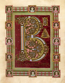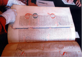 ![]() 回廊に飾られた黄金の福韻書の ファクシミリページの前で ランギーニ館長による説明が行われます |