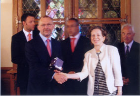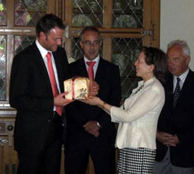 ![]() MGより、館長のランギーニ氏へ 贈り物を手渡します 友好の握手 |