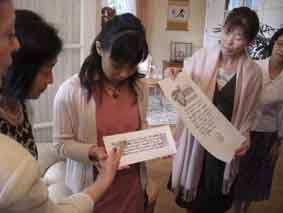 ![]() 装飾や書体に関する質問が 活発に飛び交います みなさん、作品をのぞき込み 興味津々の様子です |