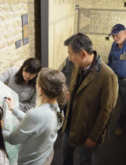 AVENTICUM At the end of the 1st century B.C., Avenches had become a Roman settlement. Under the reign of August during the 1st century A.D. , it was the largest city and the capital of Romanized Swiss tribes. Its name comes from the spring goddess Aventia. Under Roman patronage Aventicum developed into a blooming commercial center with over 20,000 inhabitants. Its amphitheater is well preserved and the Roman museum presents a good collection of daily life items as well as a bust of Emperor Marcus Aurelius in pure gold (one of three found in Europe). Other sites include the public baths, a theater, a temple and parts of the city walls. Avenches belongs to the list of most important archeological sites of Switzerland. The members of MG School were given special permission to take stone rubbings of inscriptions. 紀元前15年頃、Avenches (ラテン名Aventicum)はローマの集落になりました。紀元1世紀、皇帝アウグストゥスの支配下、ヘルヴェティアの首都でした。名前は、春の女神Aventiaから来ています。ローマの庇護を受けていたヘルウェティイ族の商業の中心地へと発展したここの町の人口はおよそ20,000人でした。 円形劇場の保存状態は非常に良く、その他、浴場、神殿、劇場と町の廻りには城壁の跡が残っています。ローマの博物館の中に発掘された作品の中に皇帝のマルクス・アウレリウスの黄金の胸像があります(在位:161年 – 180年)。スイスでは、Avenchesが最も重要な遺跡の一つです。 MGスクールは特別な許可を得て、拓本を採る事が出来ました。